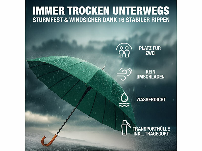 Stabil bei Wind und Sturm: 16 stabile Rippen halten Ihren Schirm in Form, auch bei kräftigen Böen. Kein Flattern, kein Umklappen - Ihr Schirm liegt jederzeit sicher in der Hand und schützt Sie verlässlich vor Wind und Wetter.