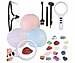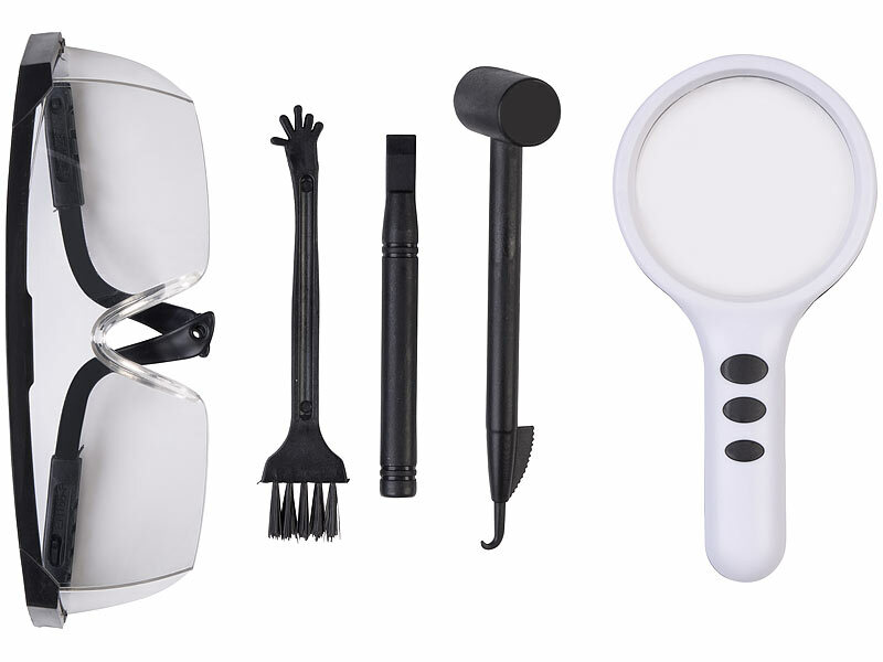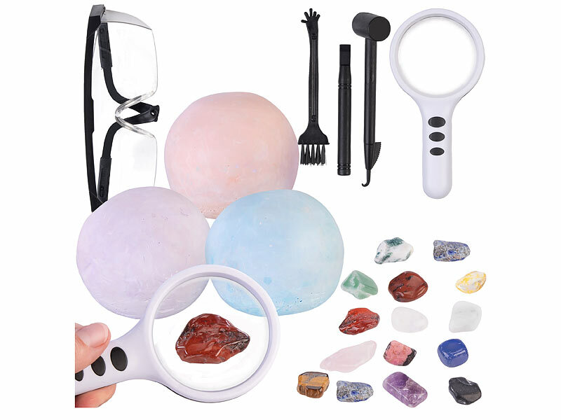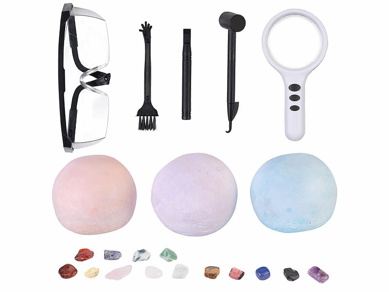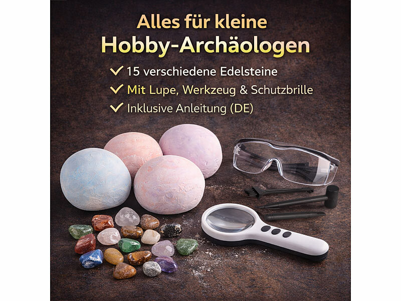 Ausgrabungsset mit 15 Edelsteinen inklusive Aufbewahrungstasche, Informationskarten, 3 Gips-Ausgrabungskugeln, Schutzbrille, Lupe, kleinem Hammer, kleinem Meisel, Bürste und deutscher Anleitung