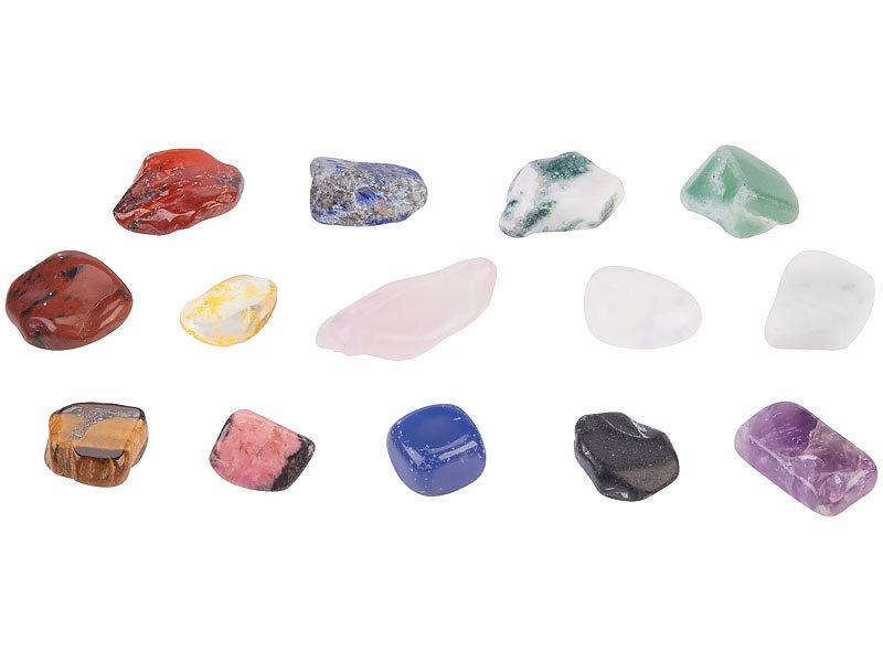 Immer ein anderer Stein: enthält Obsidian, Rosenquarz, Achat, Sodalith, Rhodonit, Howlith, Tigerauge, Granat, Moosachat, Aventurin, Bergkristall, Jaspis, Fluorit, Amethyst und Citrin