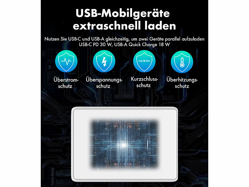 revolt USB Ladegerät für Tablet: Flaches USB-Netzteil mit USB-C PD 30 W, USB-A Quick Charge 18 W