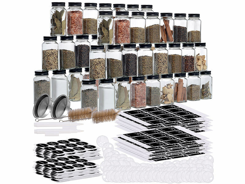 Gewürzgläser-Set inklusive 48 Gläsern, Bürste, 480 Etiketten, 2 Trichtern, 2 weißen Stiften, 96 Streueinsätzen und deutscher Anleitung - Spice Jars - Außerdem relevant oder passend zu: Knoblauch, Schublade