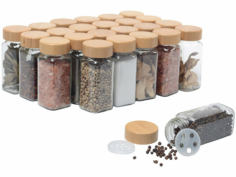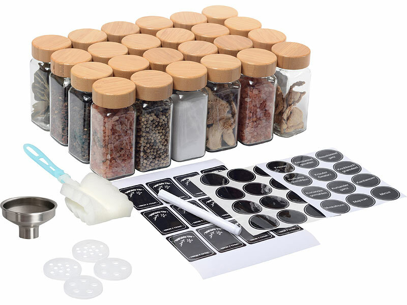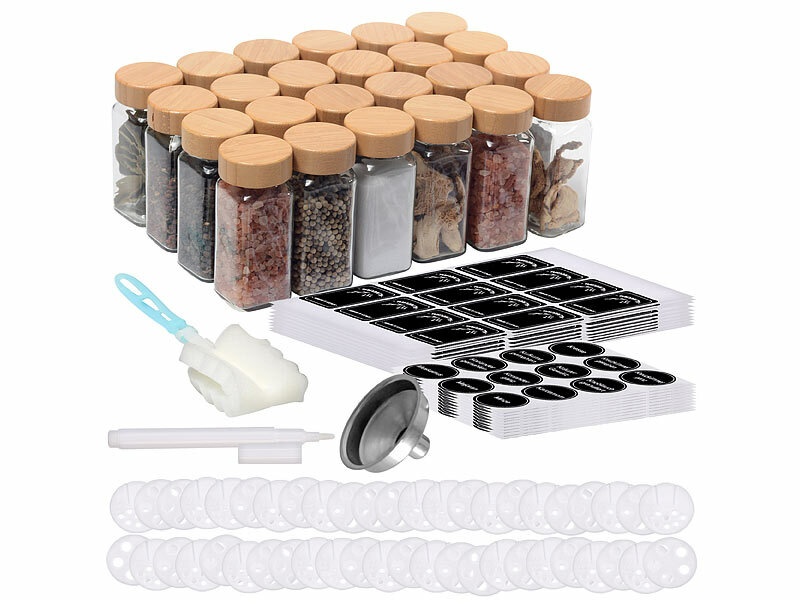 Gewürzgläser-Set mit Bambusdeckel inklusive 48 Gläsern, Schwammbürste, 480 Etiketten, Trichter, weißem Stift, Streueinsätzen und deutscher Produktinformation - Gewürzaufbewahrungen - Außerdem relevant oder passend zu: Regal, Stifte, Gewürze, Schublade, Knoblauch