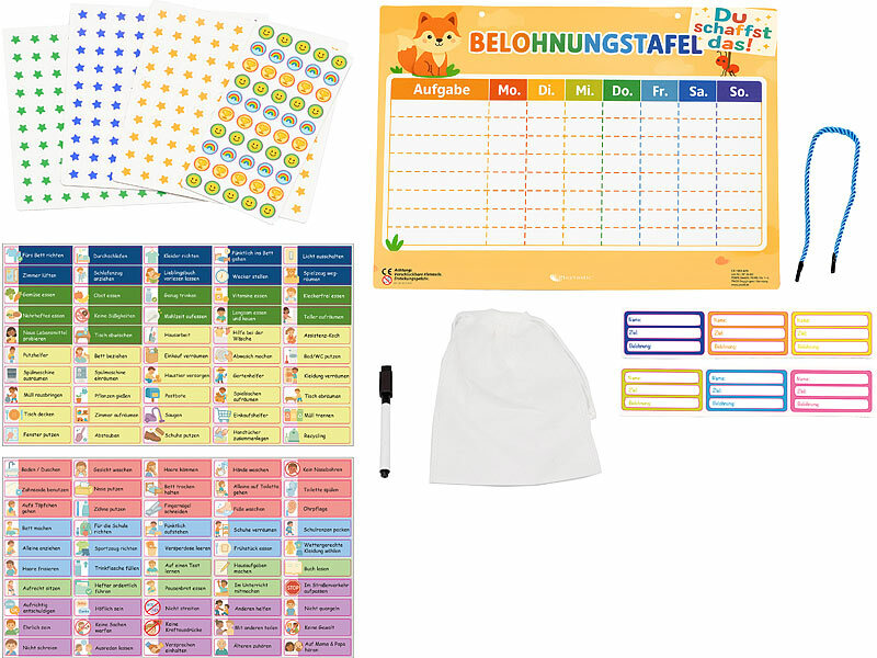 Belohnungstafel inklusive 6 Namenskarten, 350 Magneten, 100 gedruckte Aufgaben, Marker, Aufbewahrungstasche, Kordel und deutscher Anleitung