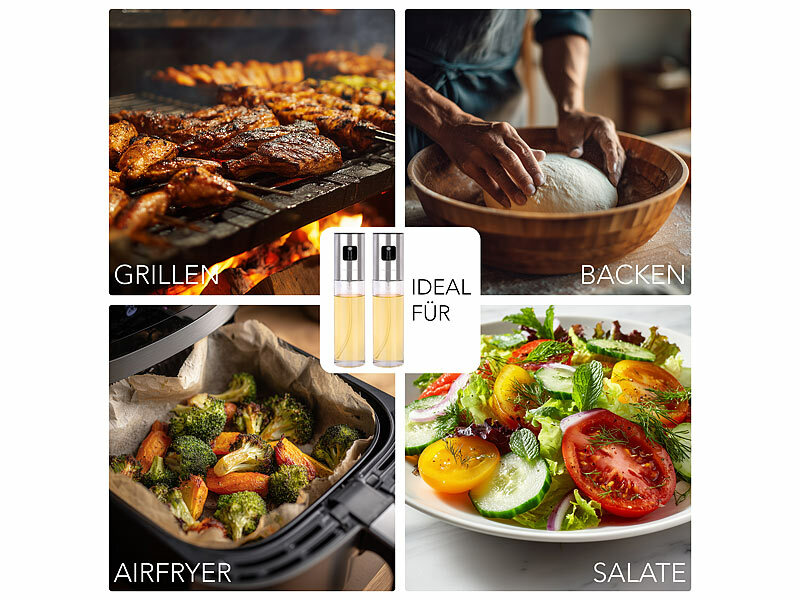 Vielseitige Einsatzmöglichkeiten in der Küche: Ob beim Grillen im Freien, beim Braten in der Pfanne, beim Nutzen der Heißluftfritteuse oder beim Zubereiten frischer Salate - die Sprüher passen sich jeder Kochsituation an. Sie erleichtern das Würzen von Fleisch, Gemüse und Backwaren und helfen Ihnen, Rezepte punktgenau umzusetzen.