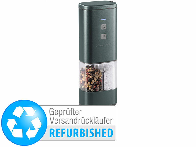 Rosenstein & Söhne 2in1-Akku-Salz- und Pfeffermühle mit Keramik-Mahlwerk, Alugehäuse