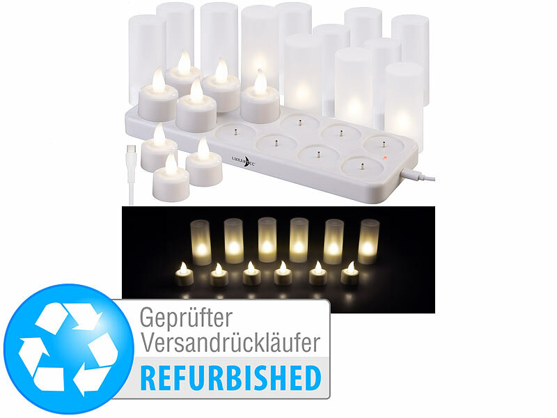 Lunartec Gastro Teelichter: 12er-Set Akku-Teelichter mit Kunststoff-Dekogläsern, Versandrückläufer