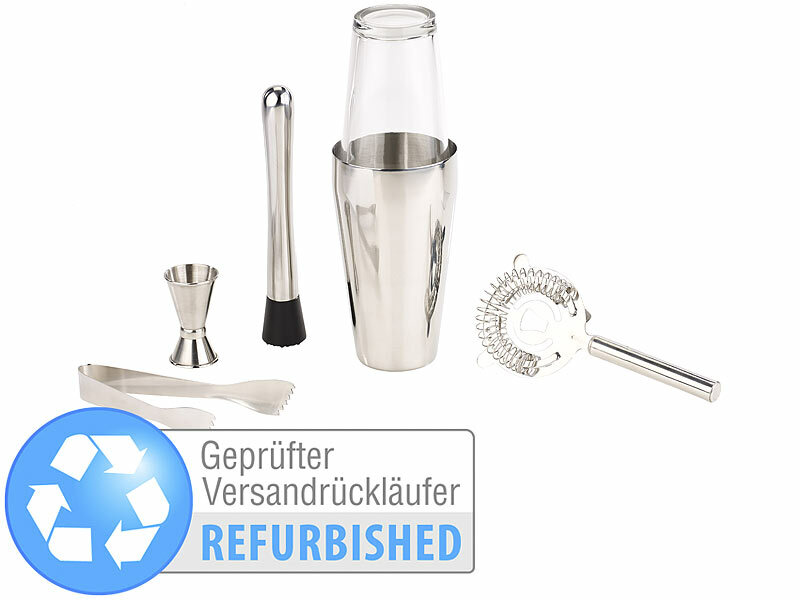 Cocktail-Shaker inklusive Glas, Sieb, Messbecher, Stößel, Zange und deutscher Anleitung