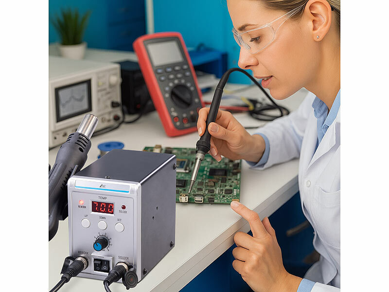 Volle Power für präzises Arbeiten: Die digitale 2in1-Löt- und Heißluftstation liefert satte 700 Watt Leistung und überzeugt in jeder Werkstatt durch schnelle Aufheizzeiten, stabile Temperaturen und kraftvolle Performance. Ideal für anspruchsvolle Bastler, Heimwerker oder Modellbauer.