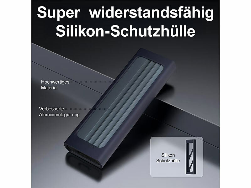 Bestens geschützt: Die weiche Silikonhülle sorgt zusammen mit dem robusten Aluminium-Gehäuse für einen optimalen Schutz Ihres Datenträgers. So transportieren Sie ihn in der Hosentasche, im Rucksack oder in der Handtasche ganz einfach und sicher.