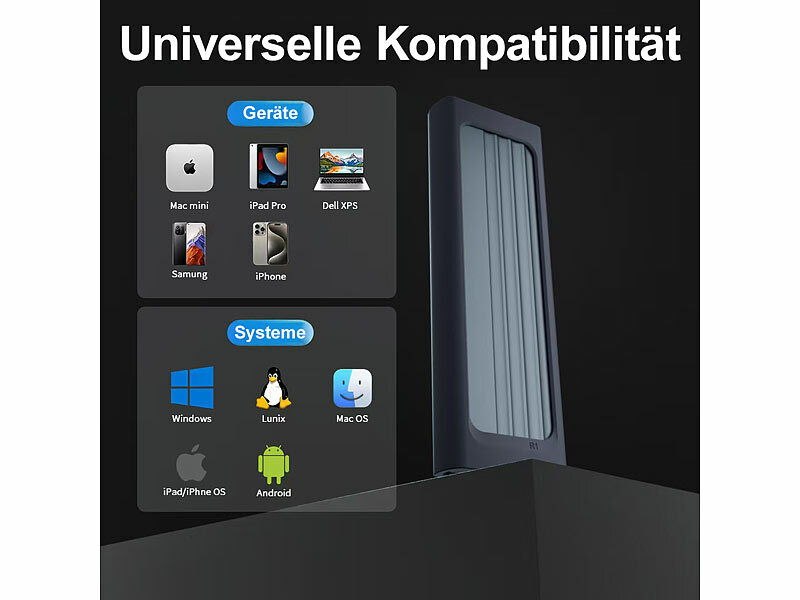 Überall anschließen und durchstarten: Dank des mitgelieferten Datenkabels USB-C auf USB-C und einem Adapter auf USB-A verbinden Sie das Datenspeichergehäuse flexibel mit aktuellen und älteren Geräten - ob am modernen USB-C-Anschluss oder an klassischen USB-A-Ports. Und Ihr Speicher ist sofort einsatzbereit.