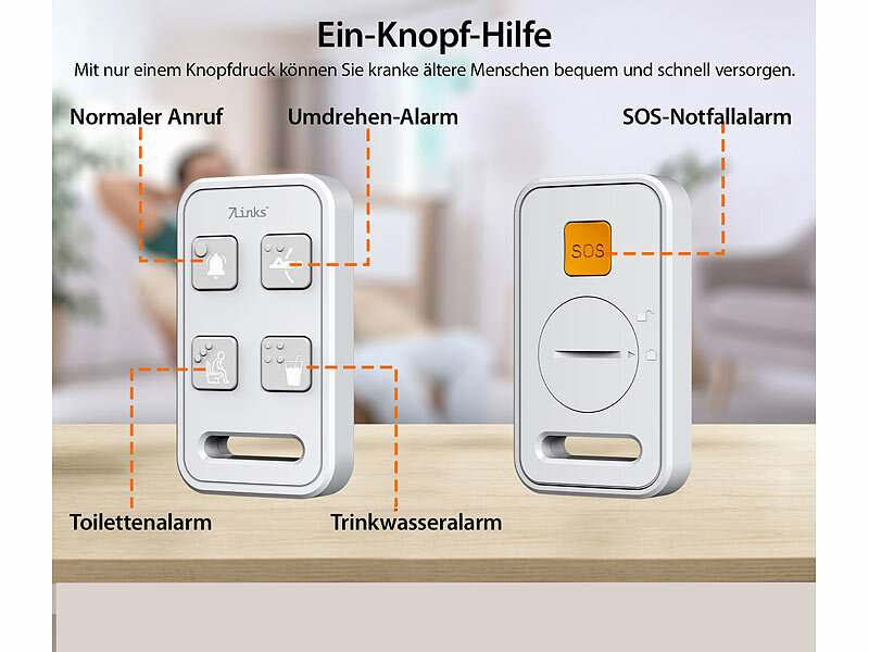 Sofort informiert bei benötigter Hilfe: Per einfachem Tastendruck auf der Fernbedienung signalisieren Ihre Angehörigen, dass sie Hilfe brauchen. Und Sie werden auf der Monitor-Einheit gleich per optischem Symbol und Sprachansage über die Art der benötigten Hilfe informiert. Ob für allgemeine Hilfe, gewünschten Wechsel der Liegeposition, Toilettengang oder Durst. Oder als SOS-Notruf für besonders dringende Hilfe.