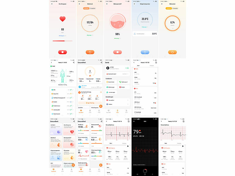 | Produktgruppe: Smarte Fitness-Uhren mit EKG-, Blutdruck- und Körpertemperatur-Anzeige von € 32,18 bis € 36,99 | Produktgruppe: Fitness-Armband mit Blutdruck- und Herzfrequenz-Anzeige, Bluetooth von € 46,43 bis € 53,99 |