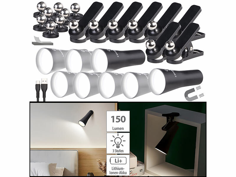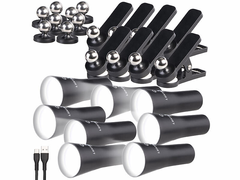 Lunartec 8er-Set 4in1-Akku-Tisch-,Wand-, Klemm- und Taschenlampen, 3 Leuchtmodi